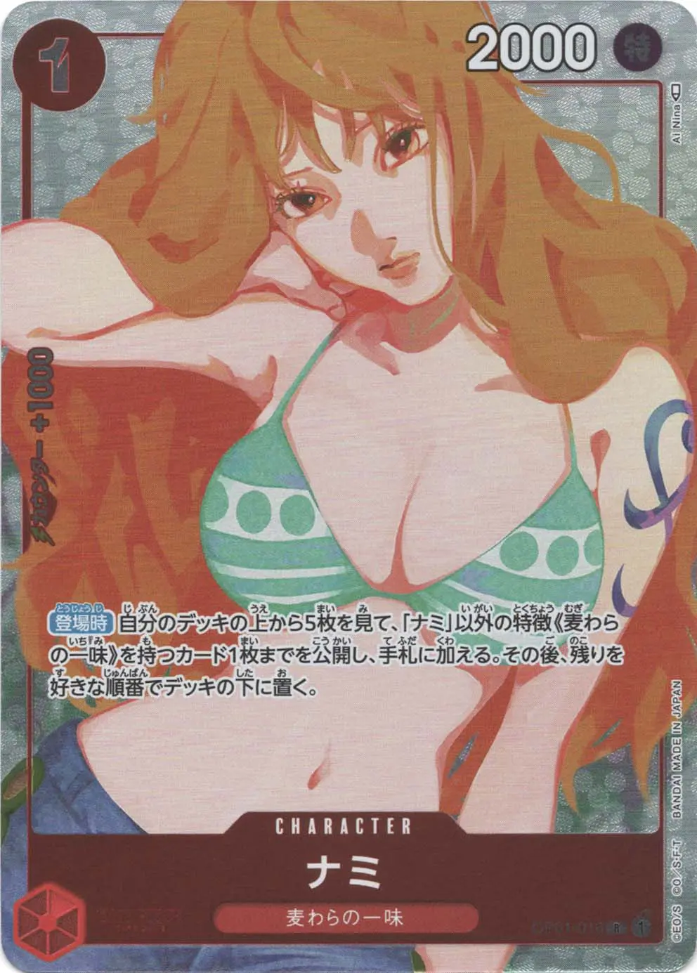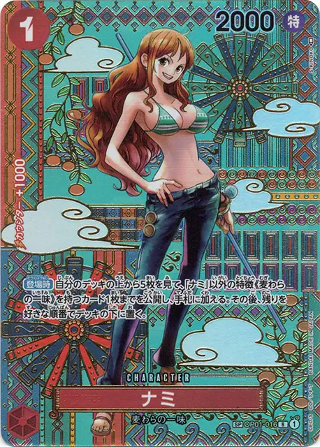 同じ《OP01-016》の型番を持つカードにスーパーパラレルのナミが存在する「ナミ《OP01-016》」は、どのイラストのカードであっても、再録の有無にかかわらずスタンダードレギュレーションで原則使用可能となります。