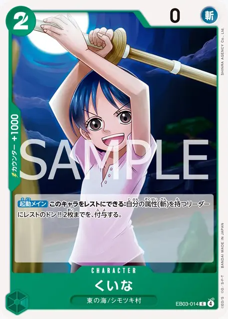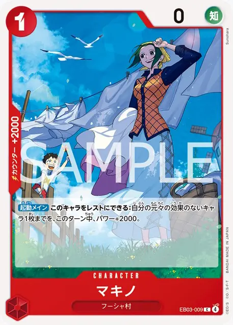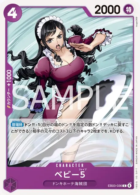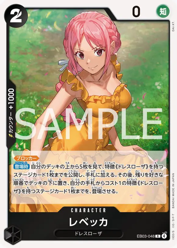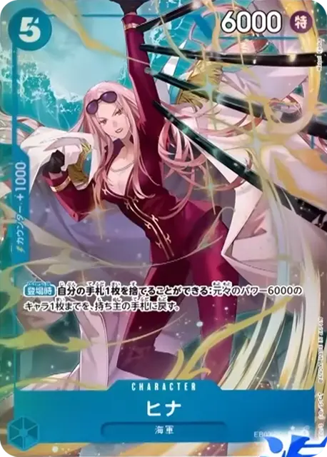 | テキスト ブロッカー 登場時自分のデッキの上から5枚を見て、パワー1000以下のキャラカードかイベント1枚までを公開し、手札に加える。その後、残りを好きな順番でデッキの下に置く。 | |||