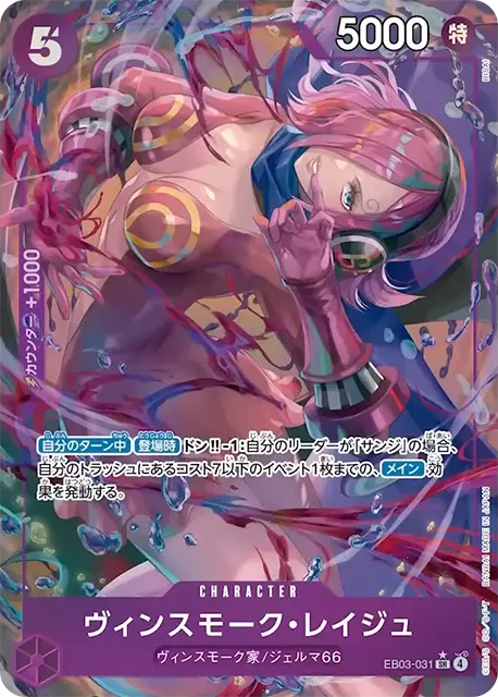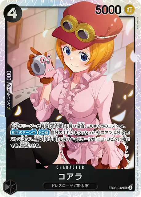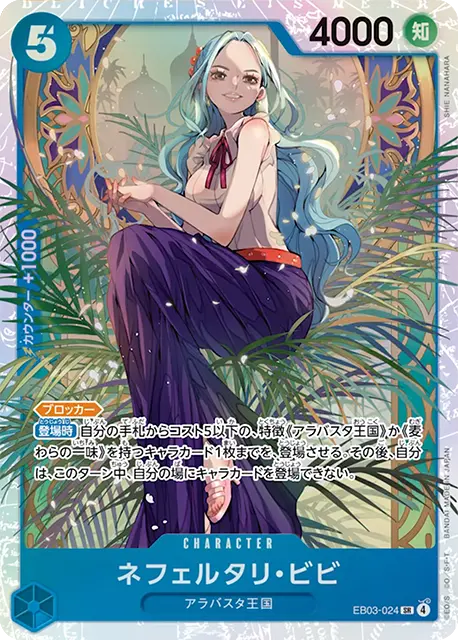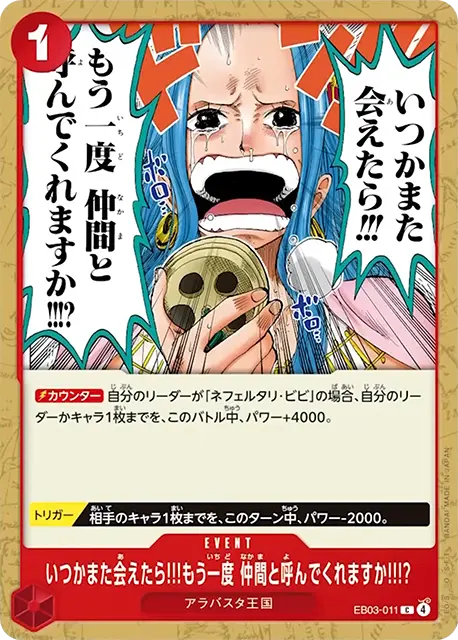 | テキスト カウンター自分のリーダーが「ネフェルタリ・ビビ」の場合、自分のリーダーかキャラ1枚までを、このバトル中、パワー+4000。 トリガー相手のキャラ1枚までを、このターン中、パワー-2000。 | |||