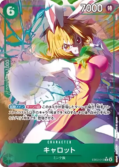 | テキスト 自分のターン中登場時自分のライフが2枚以下の場合、カード1枚を引く。 トリガー自分のリーダーが「ベガパンク」の場合、このカードを登場させる。 | |||
