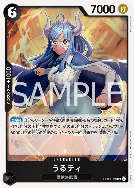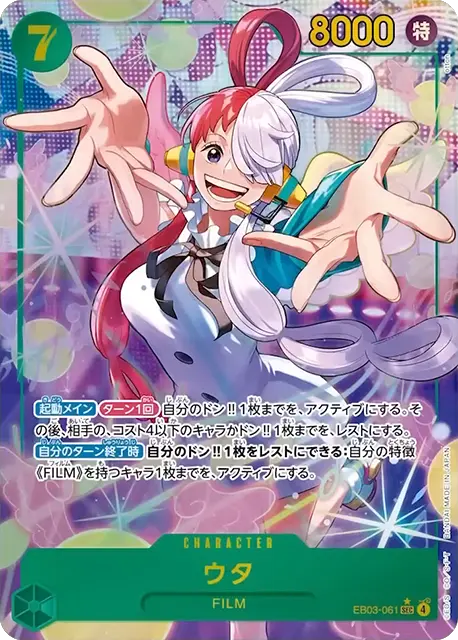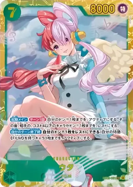 | テキスト 登場時自分のリーダーが「ウタ」の場合、カード2枚を引く。その後、自分の手札からパワー6000以下の元々の効果のないキャラカード1枚までを、登場させる。 | |||