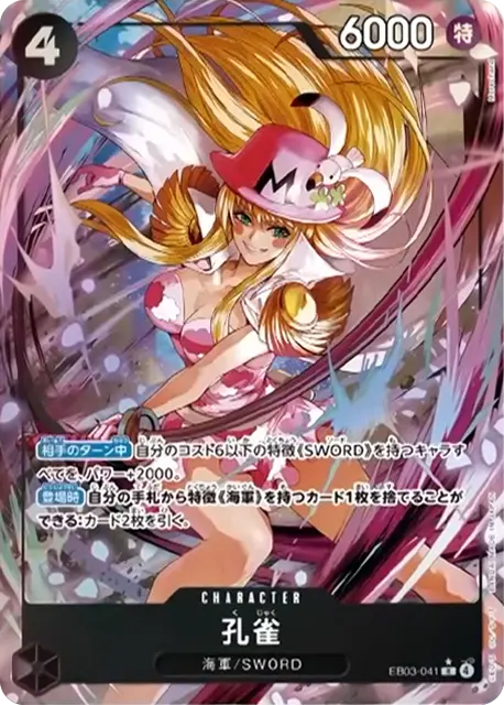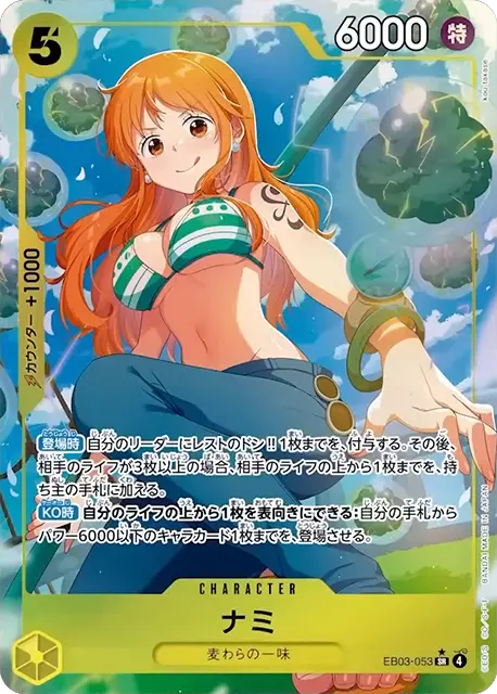 | テキスト メイン自分のリーダーが「ナミ」の場合、自分のデッキの上から4枚を見て、コスト2から8のカード1枚までを公開し、手札に加える。その後、残りを好きな順番でデッキの下に置く。 トリガーこのカードのメイン効果を発動する。 | |||