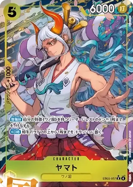 | テキスト 登場時自分の特徴《ワノ国》を持つリーダーにレストのドン!!3枚までを、付与する。 KO時相手のライフの上から1枚までを、トラッシュに置く。 | |||