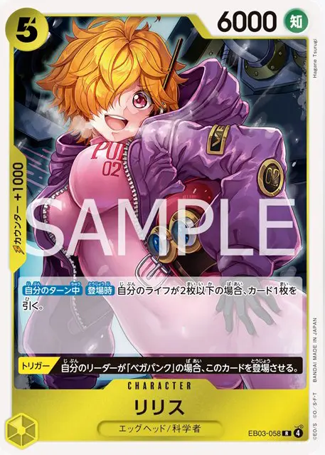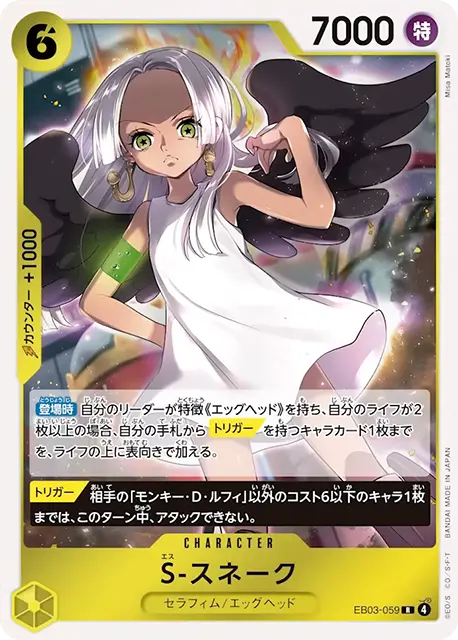 | テキスト 登場時自分のリーダーが特徴《エッグヘッド》を持ち、自分のライフが2枚以上の場合、自分の手札からトリガーを持つキャラカード1枚までを、ライフの上に表向きで加える。 トリガー相手の「モンキー・D・ルフィ」以外のコスト6以下のキャラ1枚までは、このターン中、アタックできない。 | |||