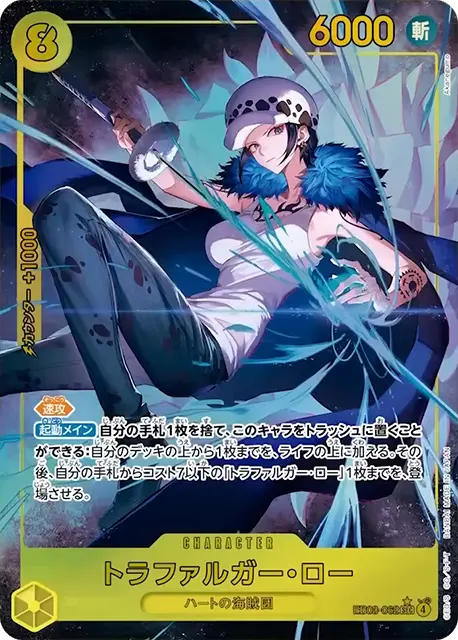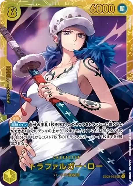 | テキスト 速攻 起動メイン自分の手札1枚を捨て、このキャラをトラッシュに置くことができる:自分のデッキの上から1枚までを、ライフの上に加える。その後、自分の手札からコスト7以下の「トラファルガー・ロー」1枚までを、登場させる。 | |||