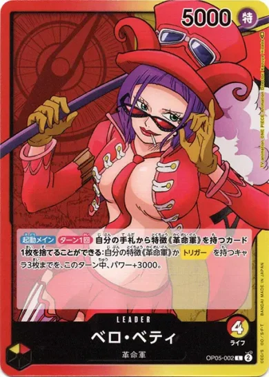 | テキスト 登場時自分のデッキの上から5枚を見て、「ベロ・ベティ」以外の特徴《革命軍》を持つカード1枚までを公開し、手札に加える。その後、残りを好きな順番でデッキの下に置く。 | |||