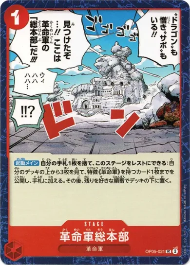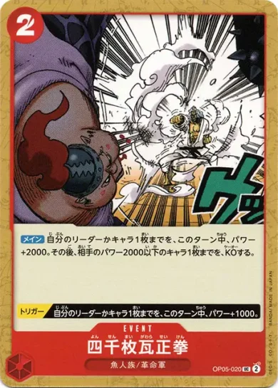 | テキスト 登場時自分のリーダーが特徴《革命軍》を持つ場合、相手のリーダーかキャラ1枚までを、このターン中、パワー-1000。 アタック時このキャラのパワーが7000以上の場合、相手のリーダーかキャラ1枚までを、このターン中、パワー-1000。 | |||