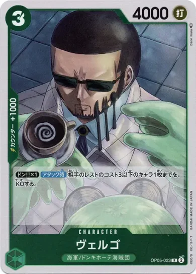 | テキスト メイン相手のライフの枚数以下のコストを持つ相手のキャラ1枚までを、KOする。 トリガーこのカードのメイン効果を発動する。 | |||