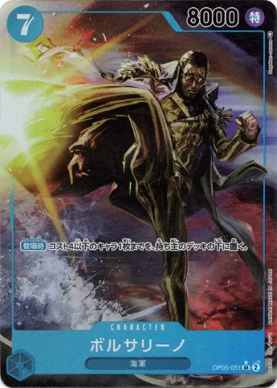 | テキスト 登場時自分のリーダーが特徴《革命軍》を持つ場合、相手のキャラ1枚までを、このターン中、パワー-3000。 | |||