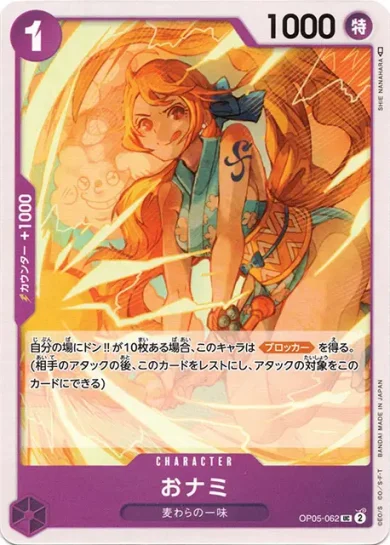 | テキスト 登場時自分のデッキの上から5枚を見て、「ナミ」以外の特徴《麦わらの一味》を持つカード1枚までを公開し、手札に加える。その後、残りを好きな順番でデッキの下に置く。 | |||