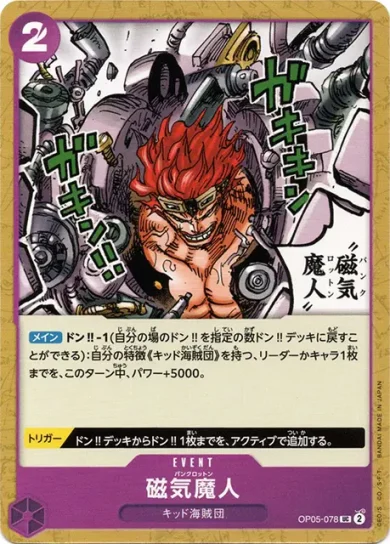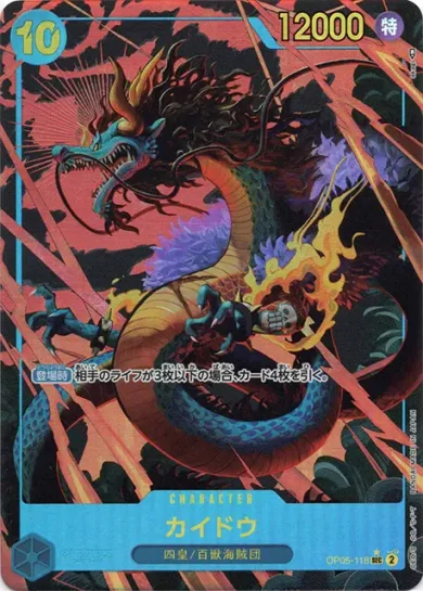 | テキスト 登場時相手のパワー2000以下のキャラ1枚までを、KOする。 トリガー自分のリーダーが多色の場合、このカードを登場させる。 | |||