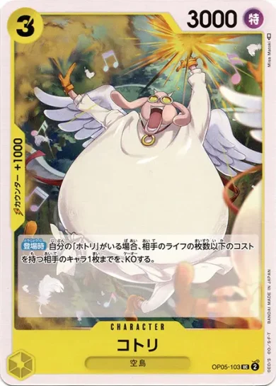 | テキスト 登場時自分の手札から「コトリ」1枚を、登場できる:相手のコスト3以下のキャラ1枚までを、相手のライフの上か下に表向きで加える。 | |||