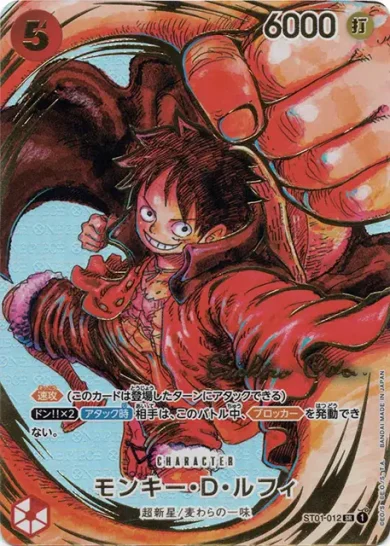 ワンピースカードゲーム1周年を記念して、原作者である尾田栄一郎先生描き下ろしイラストの「モンキー・D・ルフィ《ST01-012》」が収録されています。