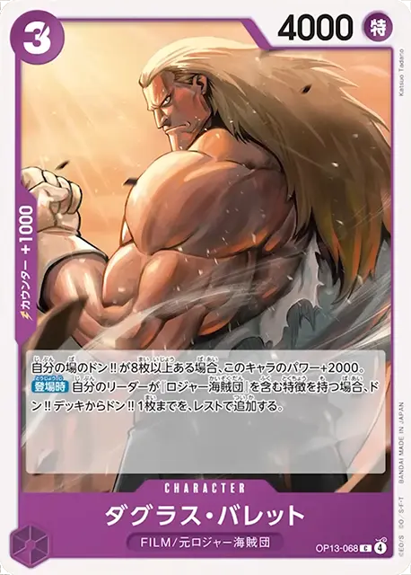 | テキスト 登場時自分の場のドン!!を1枚以上ドン!!デッキに戻すことができる:カード1枚を引き、このキャラは、このターン中、速攻を得る。 | |||