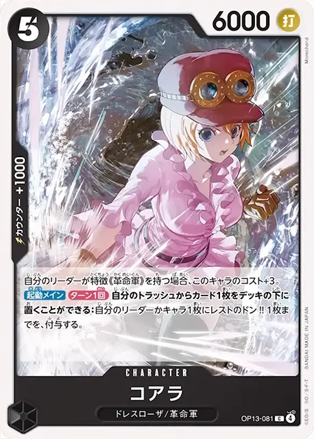 | テキスト 自分の特徴《革命軍》を持つキャラが相手の効果でKOされる場合、代わりにこのキャラをトラッシュに置くことができる。 | |||