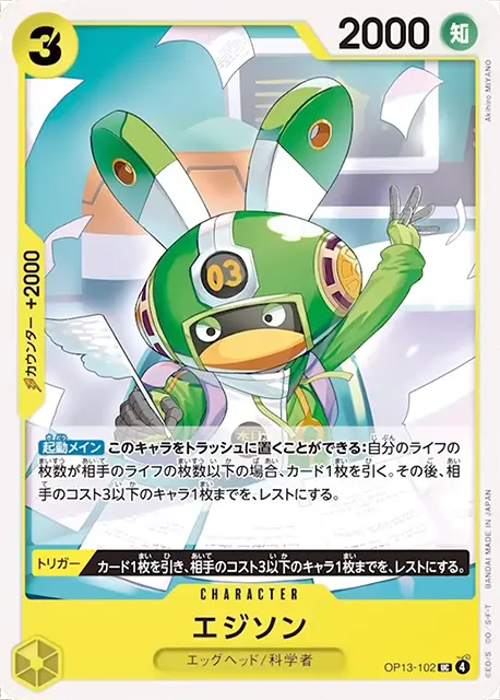 | テキスト ブロッカー 登場時自分のリーダーが特徴《エッグヘッド》を持つ場合、自分の手札からコスト5以下のトリガーを持つキャラカード1枚までを、登場させる。 | |||