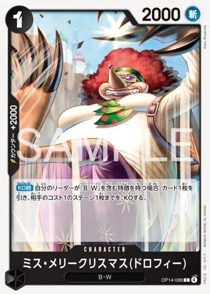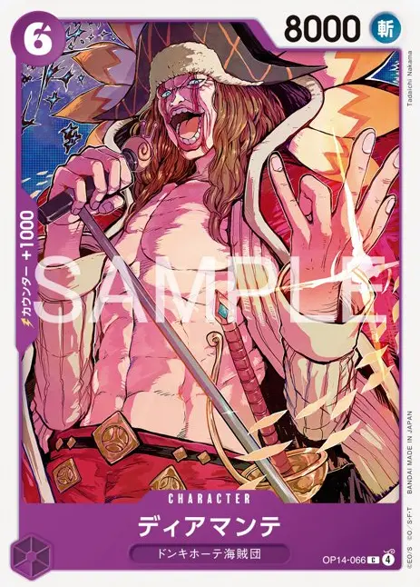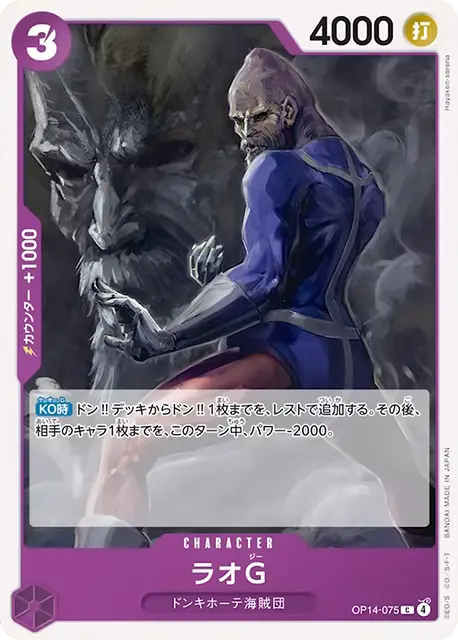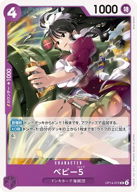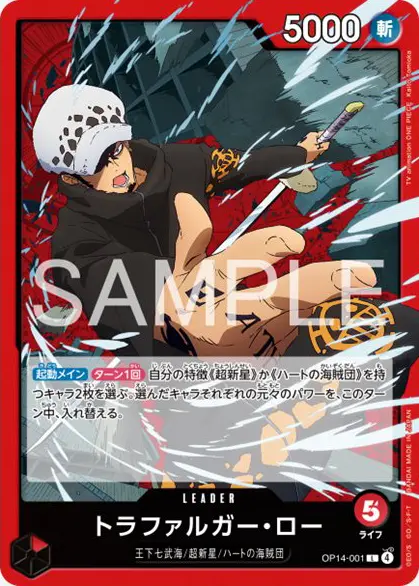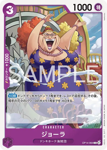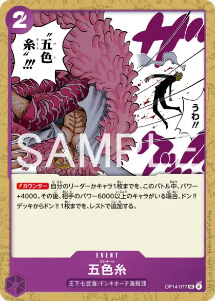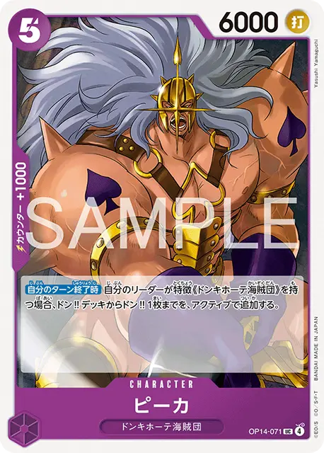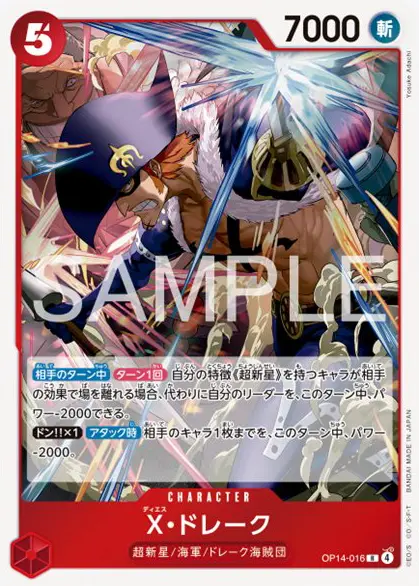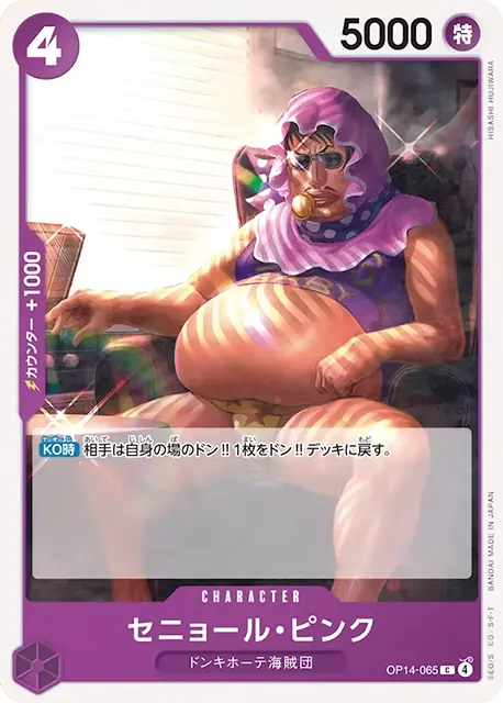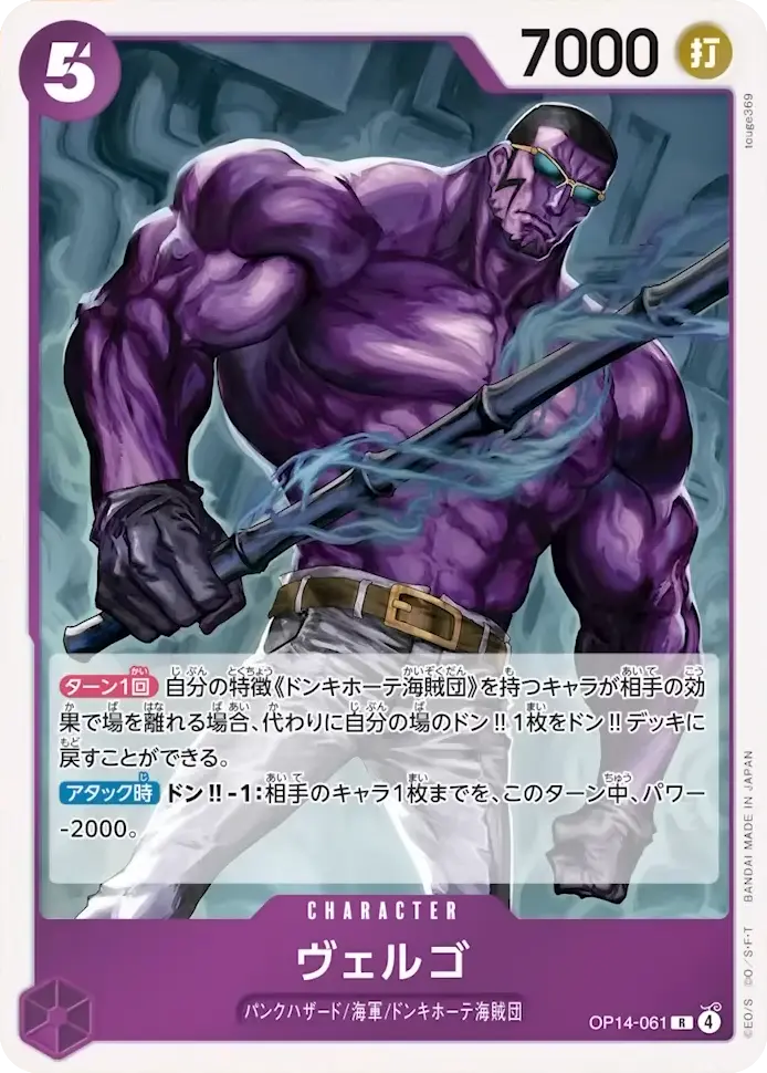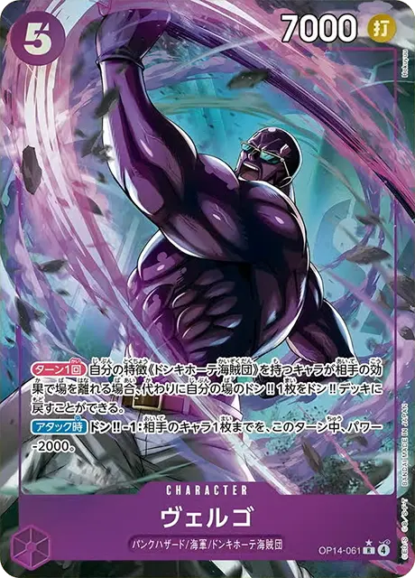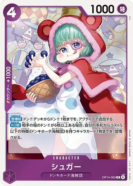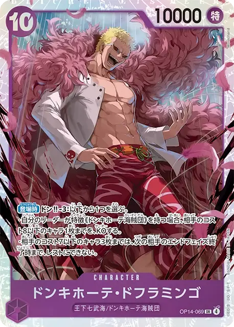 | テキスト 起動メイン自分のドン‼1枚をレストにし、このキャラをレストにできる:自分のデッキの上から5枚を見て、特徴《ドンキホーテ海賊団》を持つカード1枚までを公開し、手札に加える。その後、残りを好きな順番でデッキの下に置く。 | |||