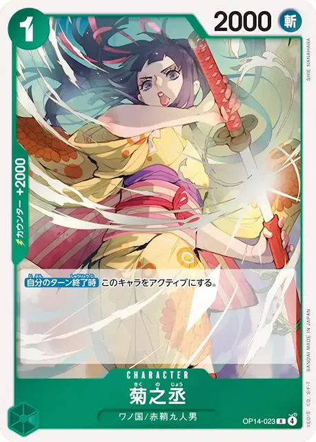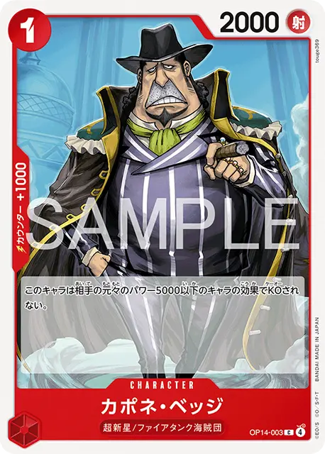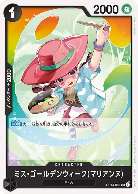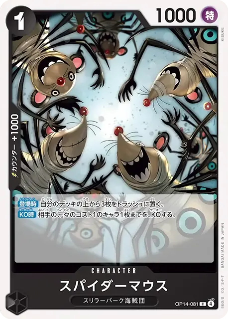 | テキスト 登場時相手のコスト9以下のキャラ1枚までは、次の相手のエンドフェイズ終了時まで、アタックできない。その後、相手のコスト0か8以上のキャラがいる場合、カード1枚を引く。 KO時自分の手札1枚を捨てることができる:このキャラをトラッシュから登場させる。 | |||
