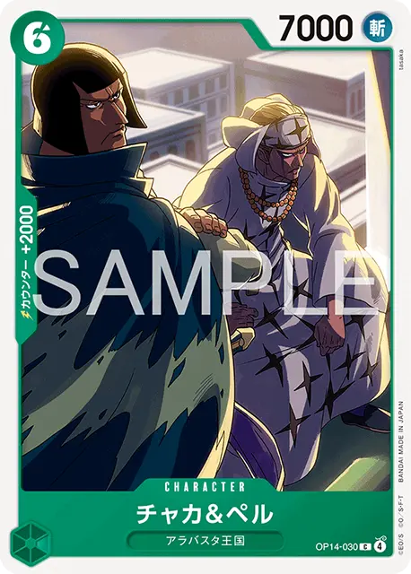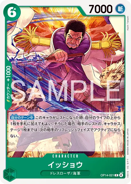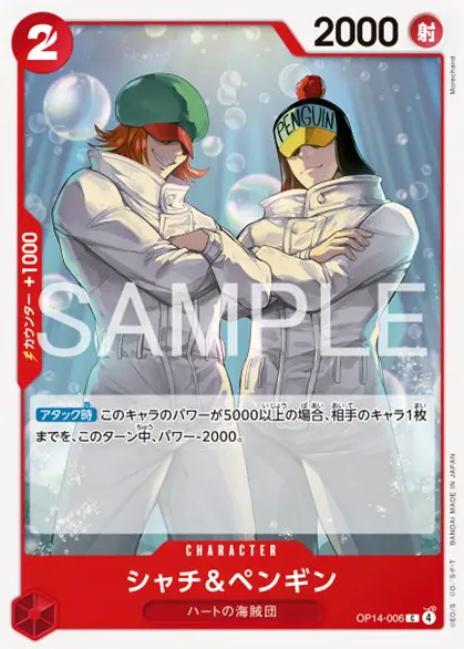| テキスト 速攻 相手のアタック時ターン1回自分の手札2枚を捨てることができる:自分のリーダーとキャラ1枚を選ぶ。選んだカードそれぞれの元々のパワーを、このバトル中、入れ替える。 | |||