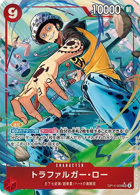 | テキスト 起動メインターン1回自分の特徴《超新星》か《ハートの海賊団》を持つキャラ2枚を選ぶ。選んだキャラそれぞれの元々のパワーを、このターン中、入れ替える。 | |||