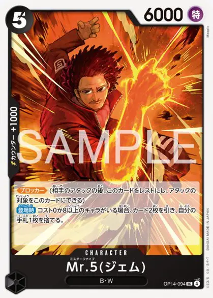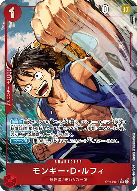 | テキスト 登場時自分のデッキの上から5枚を見て、「モンキー・D・ルフィ」以外の特徴《超新星》を持つカード1枚までを公開し、手札に加える。その後、残りを好きな順番でデッキの下に置く。 アタック時相手のキャラ1枚までを、このターン中、パワー-1000。 | |||