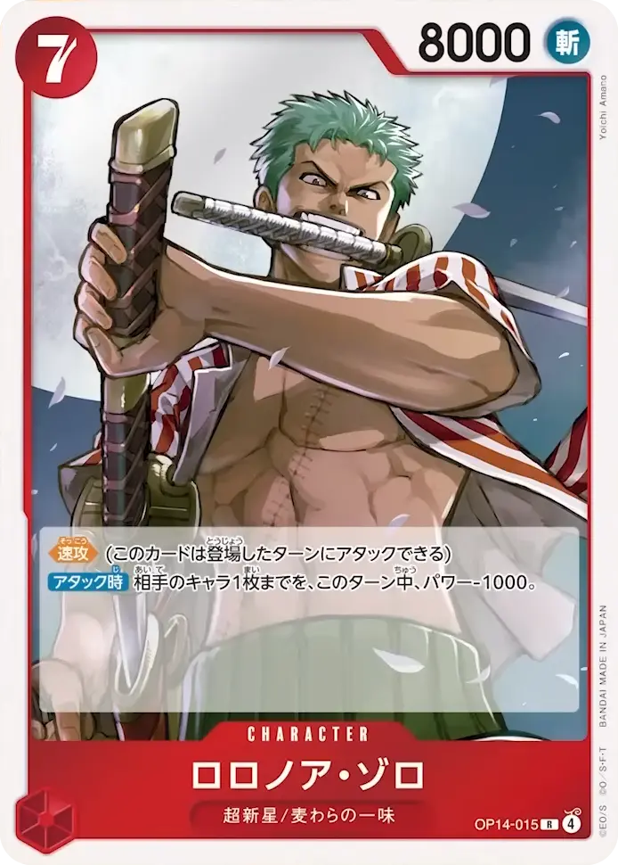 | テキスト 速攻(このカードは登場したターンにアタックできる) アタック時相手のキャラ1枚までを、このターン中、パワー-1000。 | |||