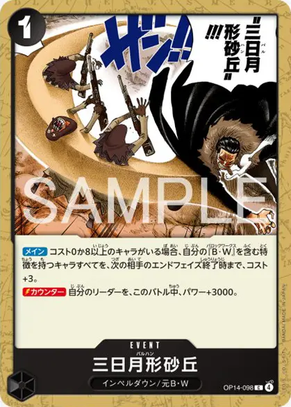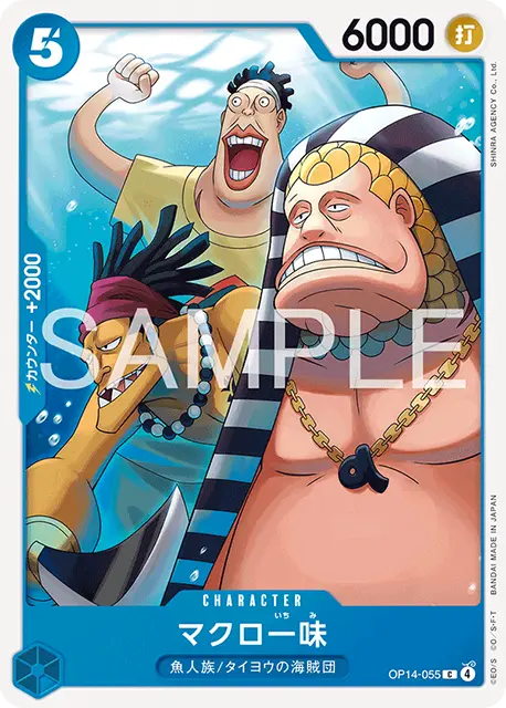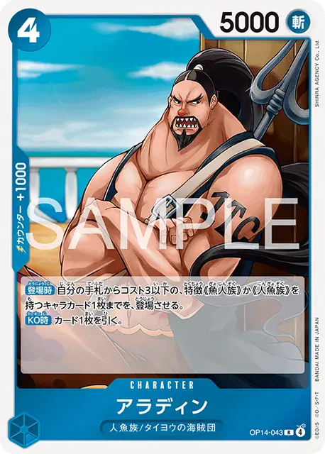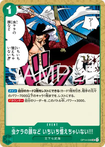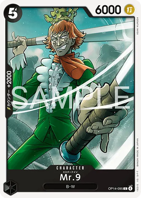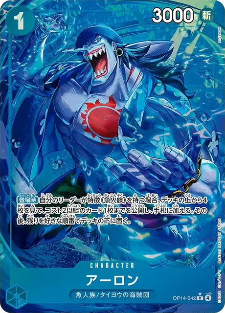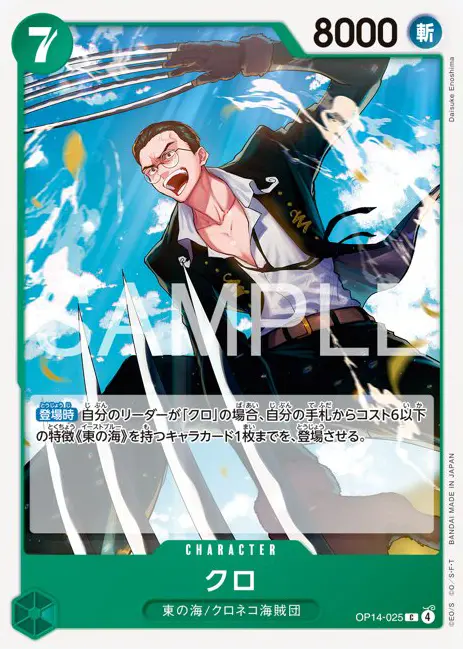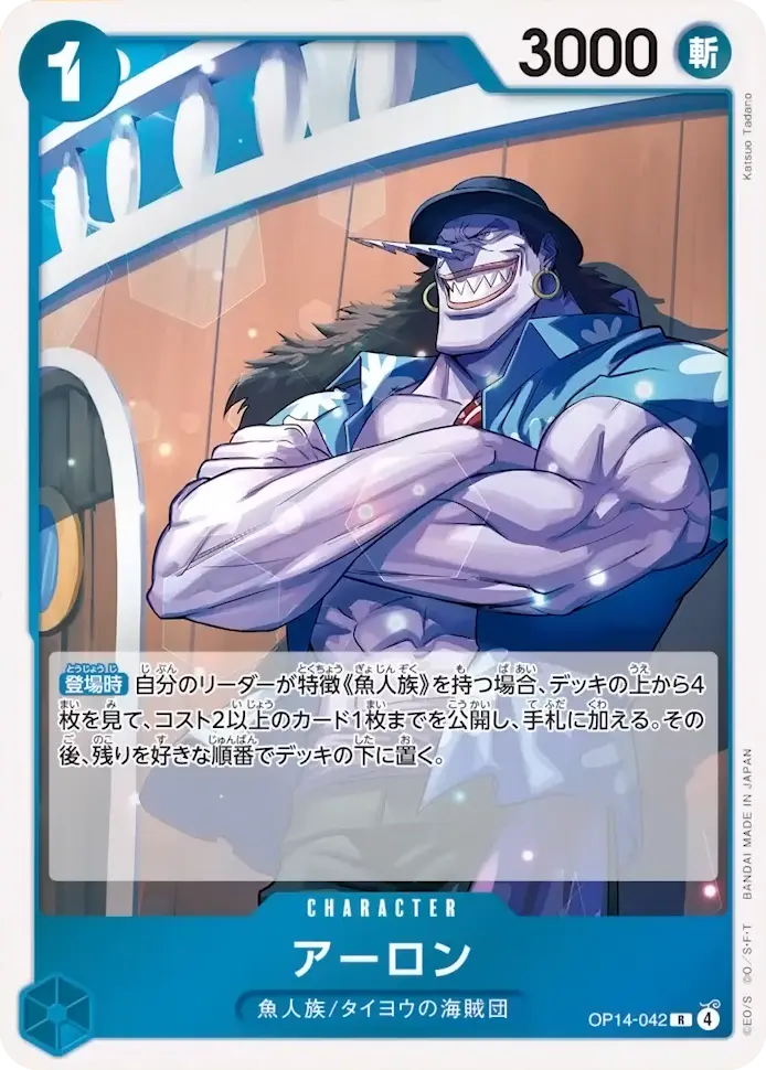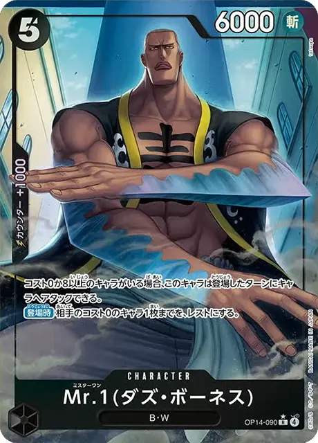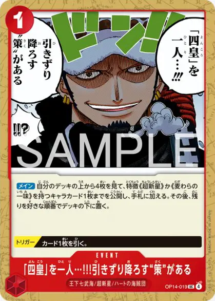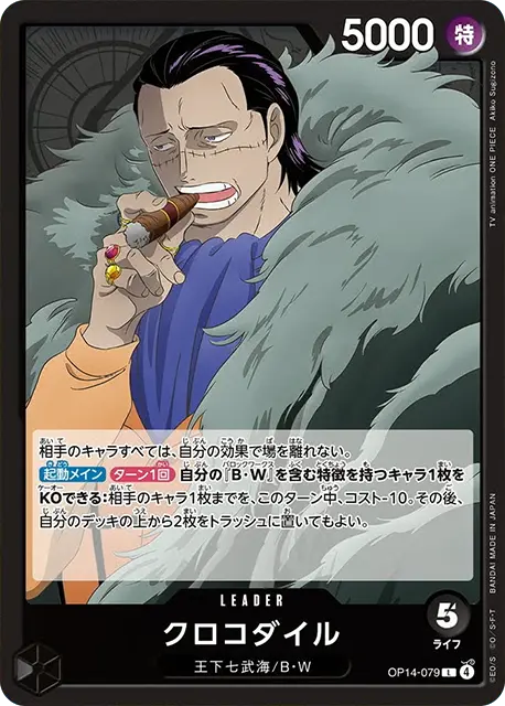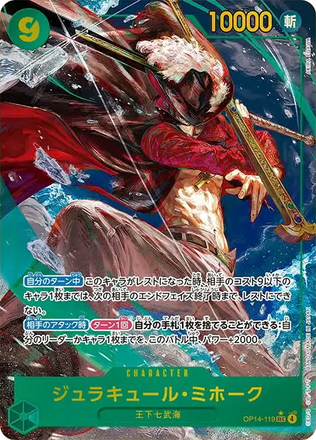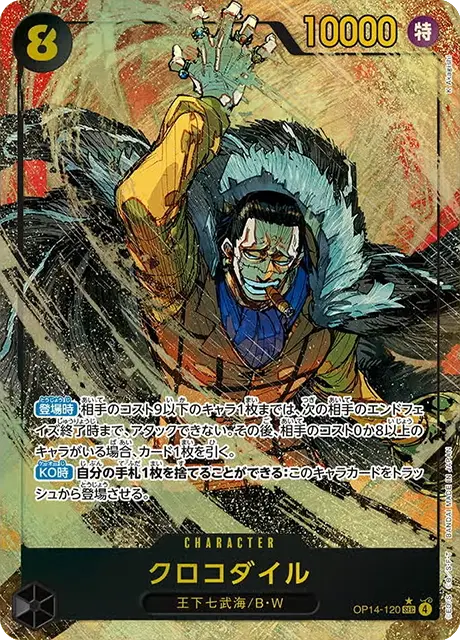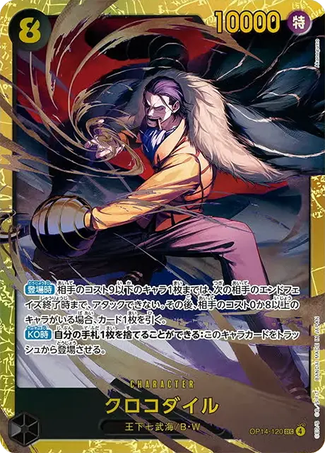 | テキスト 登場時自分のデッキの上から5枚を見て、特徴《王下七武海》を持つカード1枚までを公開し、手札に加える。その後、残りを好きな順番でデッキの下に置く。 | |||