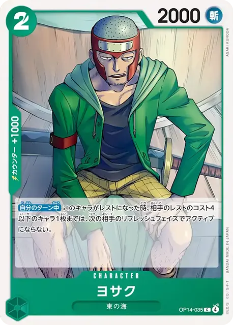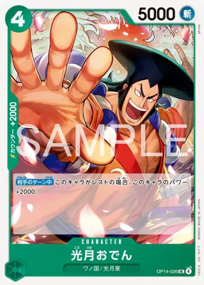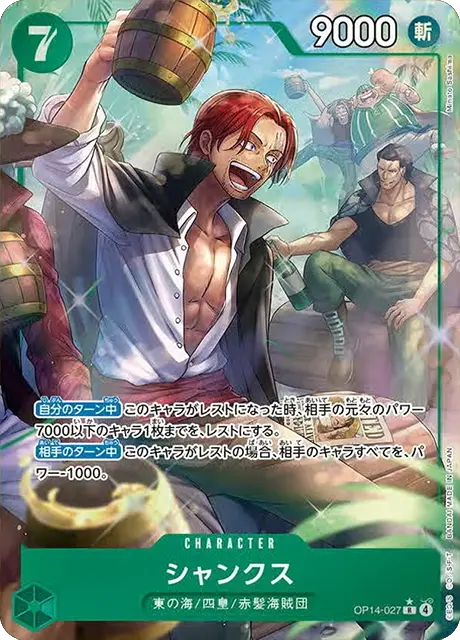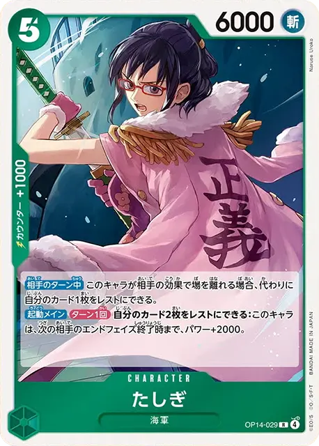 | テキスト 自分のターン中このキャラがレストになった時、相手のコスト9以下のキャラ1枚までは、次の相手のエンドフェイズ終了時まで、レストにできない。 相手のアタック時ターン1回自分の手札1枚を捨てることができる:自分のリーダーかキャラ1枚までを、このバトル中、パワー+2000。 | |||