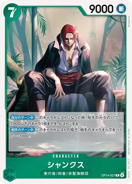 | テキスト ブロッカー 登場時自分のドン!!4枚までを、アクティブにする。その後、自分は、このターン中、元々のコスト7以上のキャラカードを登場できない。 | |||