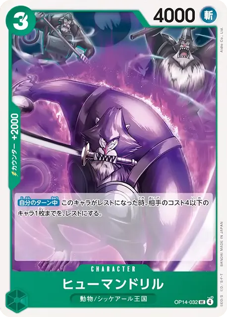 | テキスト 起動メインターン1回自分の手札から特徴《アマゾン・リリー》か《九蛇海賊団》を持つカード3枚を公開することができる:自分のリーダーとキャラすべてにレストのドン!!1枚ずつまでを、付与する。 トリガー自分のリーダーが特徴《九蛇海賊団》を持つ場合、このカードを登場させる。 | |||