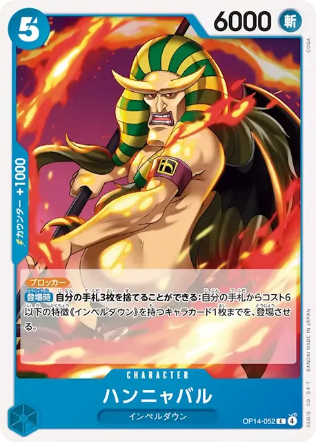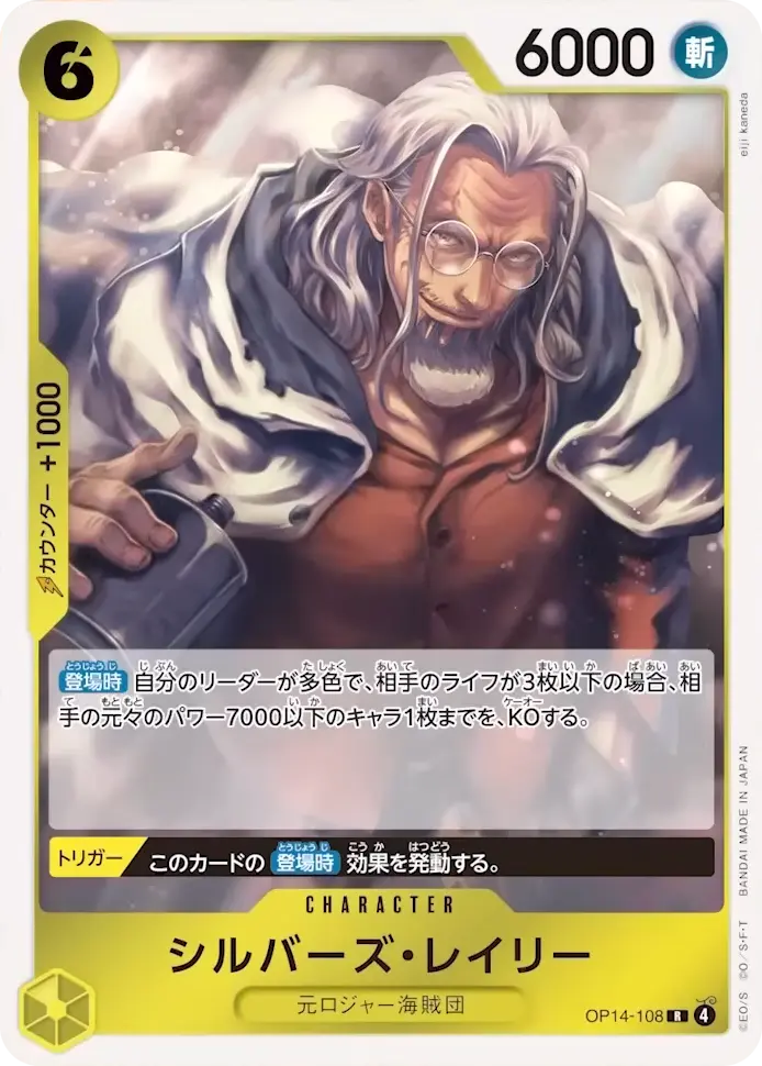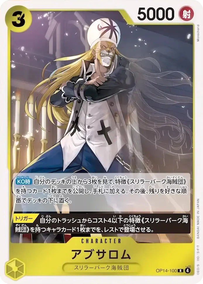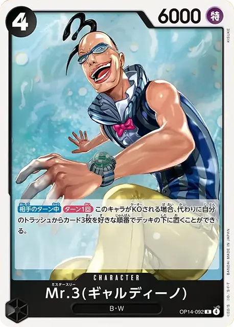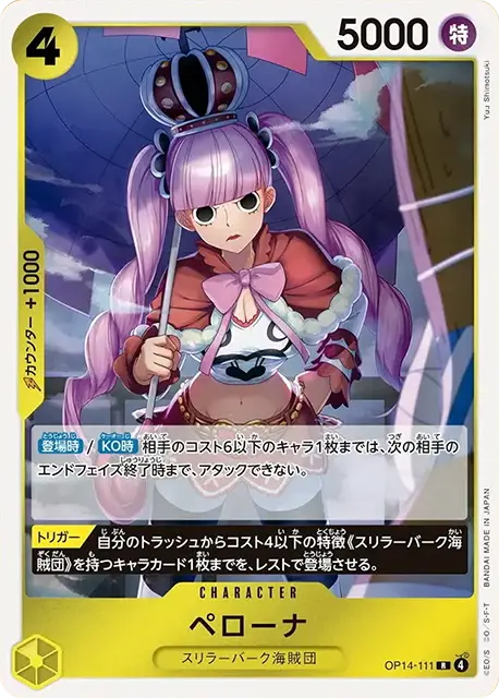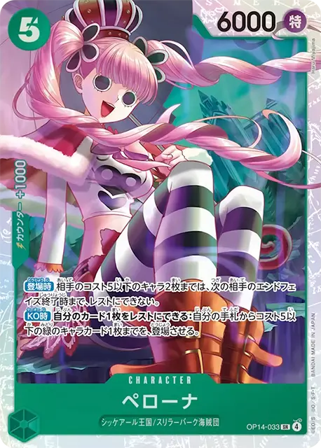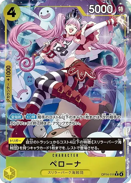 | テキスト 登場時/KO時相手のコスト6以下のキャラ1枚までは、次の相手のエンドフェイズ終了時まで、アタックできない。 トリガー自分のトラッシュからコスト4以下の特徴《スリラーバーク海賊団》を持つキャラカード1枚までを、レストで登場させる。 | |||