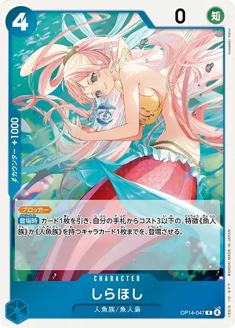 | テキスト ブロッカー 登場時自分のリーダーが特徴《超新星》を持つ場合、自分の手札からパワー2000以下の赤のキャラカード1枚までを、登場させる。 | |||
