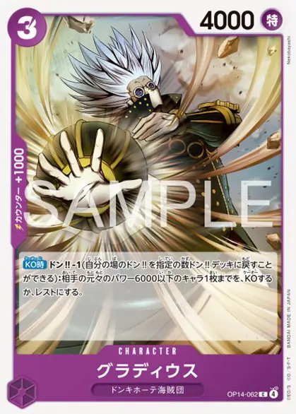 | レアリティ | ・リーダーカード:7種 ・コモン:45種 ・アンコモン:30種 ・レア:26種 ・スーパーレア:10種 ・シークレット:2種 ・スペシャルカード:6種 ・3周年スペシャル:2種 ・ドン!!カード:1種 |