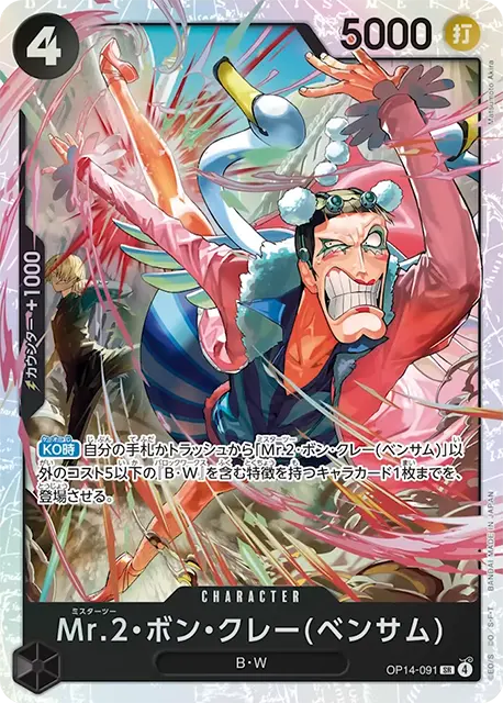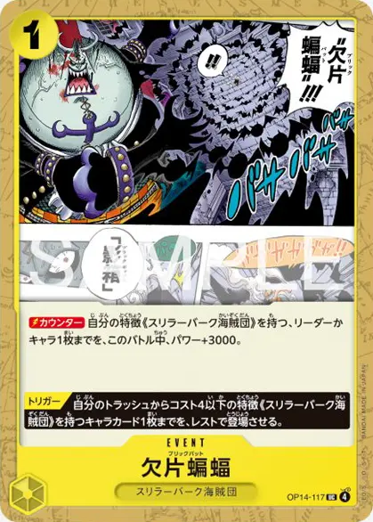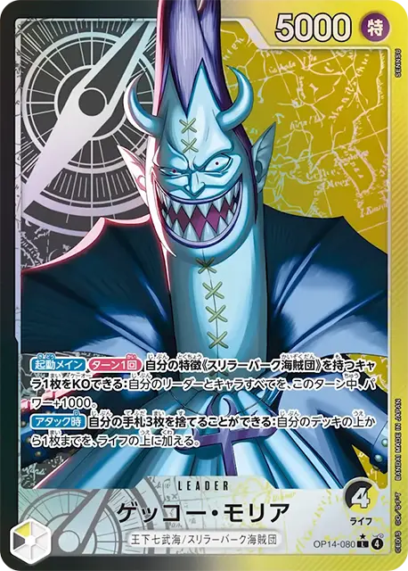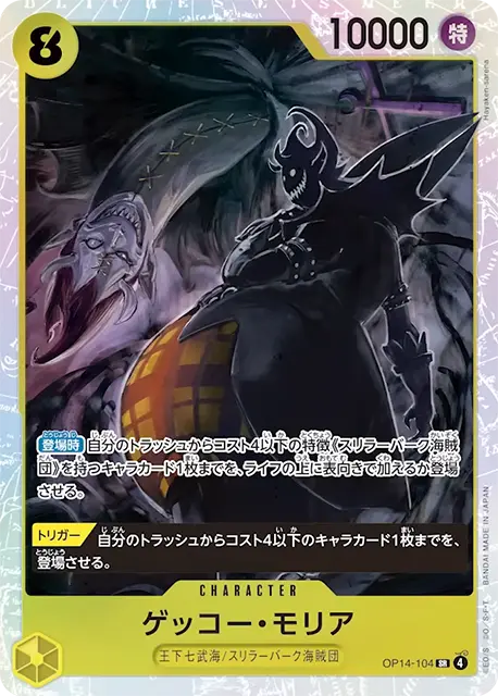 | テキスト 登場時自分のトラッシュからコスト4以下の特徴《スリラーバーク海賊団》を持つキャラカード1枚までを、ライフの上に表向きで加えるか登場させる。 トリガー自分のトラッシュからコスト4以下のキャラカード1枚までを、登場させる。 | |||