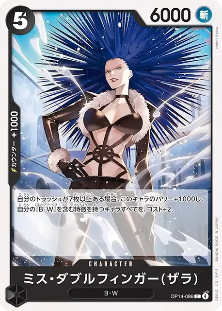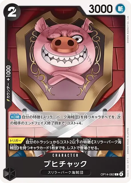 | テキスト KO時自分のトラッシュから「ドクトル・ホグバック」以外のコスト4以下のトリガーを持つキャラカード1枚までを、登場させる。 トリガー自分のトラッシュからコスト4以下の特徴《スリラーバーク海賊団》を持つキャラカード1枚までを、レストで登場させる。 | |||