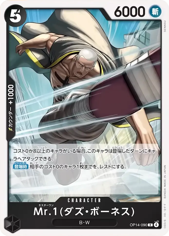 | テキスト カウンター自分の特徴《スリラーバーク海賊団》を持つ、リーダーかキャラ1枚までを、このバトル中、パワー+3000。 トリガー自分のトラッシュからコスト4以下の特徴《スリラーバーク海賊団》を持つキャラカード1枚までを、レストで登場させる。 | |||