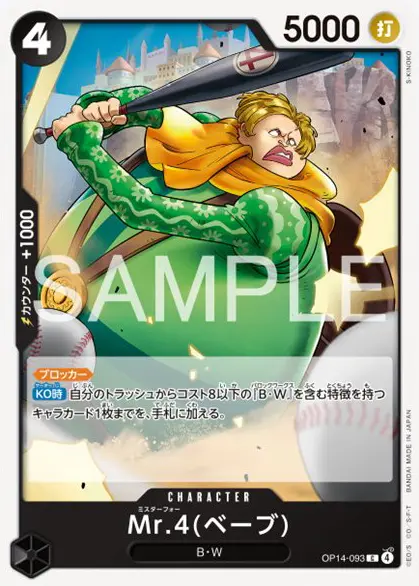 | テキスト ブロッカー トリガー自分のトラッシュからコスト4以下の特徴《スリラーバーク海賊団》を持つキャラカード1枚までを、レストで登場させる。 | |||