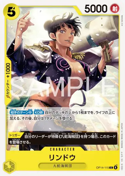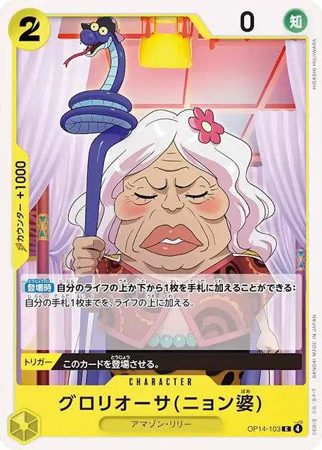 | テキスト 登場時自分のデッキの上から5枚を見て、特徴《アマゾン・リリー》か《九蛇海賊団》を持つカード1枚までを公開し、手札に加える。その後、残りを好きな順番でデッキの下に起き、自分の手札1枚を捨てる。 トリガー自分のリーダーが特徴《九蛇海賊団》を持つ場合、このカードを登場させる。 | |||