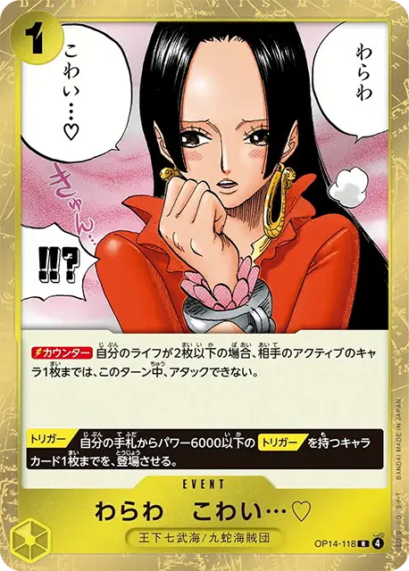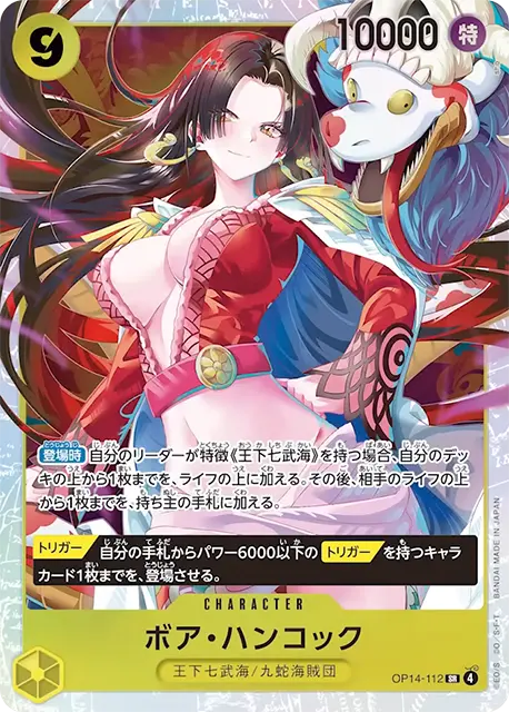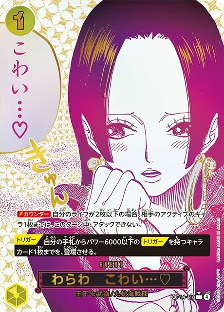 | テキスト 登場時相手のライフが3枚以下の場合、カード2枚を引き、自分の手札2枚を捨てる。 トリガー自分のリーダーが特徴《九蛇海賊団》を持つ場合、このカードを登場させる。 | |||