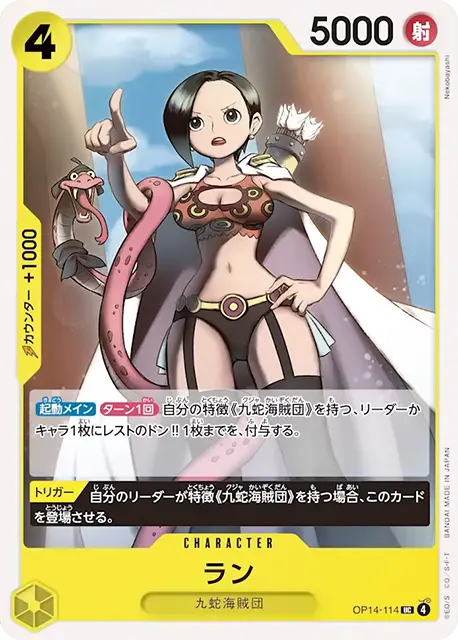 | テキスト カウンター自分のリーダーかキャラ1枚までを、このバトル中、パワー+2000。その後、自分の手札からコスト4以下の、特徴《アマゾン・リリー》か《九蛇海賊団》を持つキャラカード1枚までを、登場させる。 トリガーカード1枚を引く。 | |||