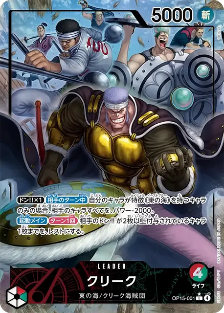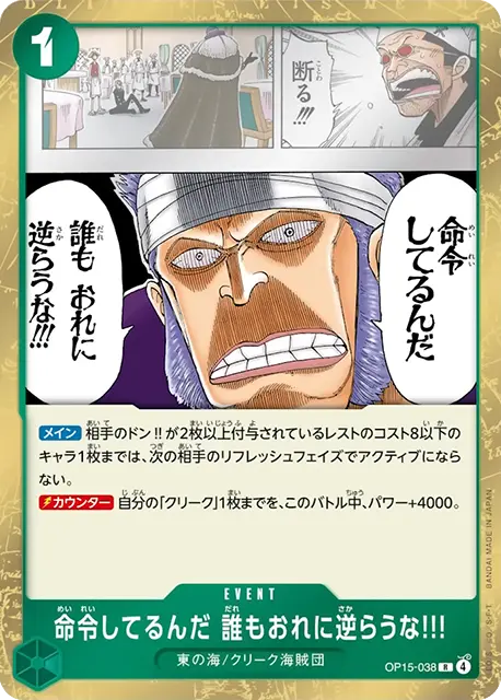 | テキスト ドン!!✕1相手のターン中自分のキャラが特徴《東の海》を持つキャラのみの場合、相手のキャラすべてを、パワー-2000。 起動メインターン1回相手のドン!!が2枚以上付与されているキャラ1枚までを、レストにする。 | |||