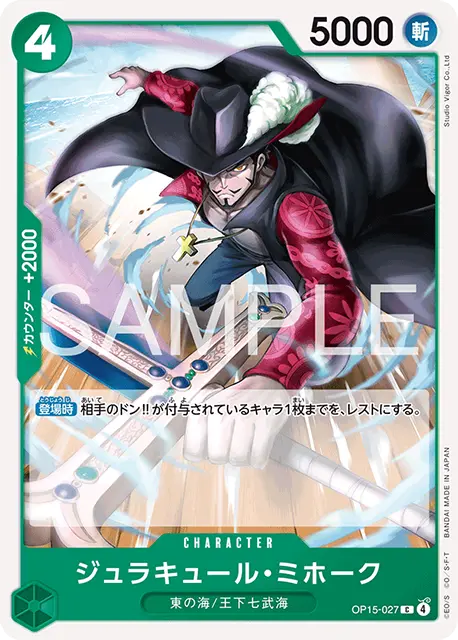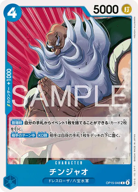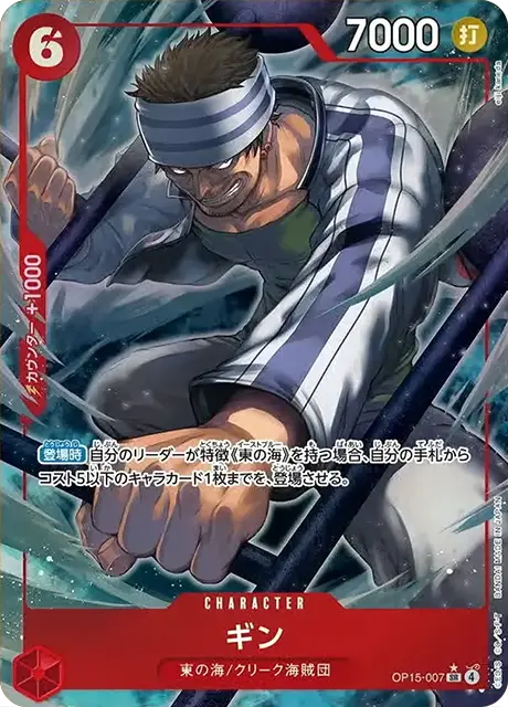| テキスト 登場時自分のリーダーが特徴《東の海》を持つ場合、自分の手札からコスト5以下のキャラカード1枚までを、登場させる。 | |||