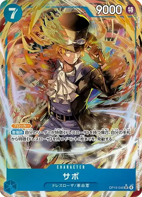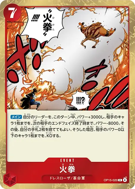 | テキスト 自分のリーダーが特徴《革命軍》を持つ場合、このキャラはブロッカーを得て、コスト+4。 登場時自分のライフの上か下から1枚を手札に加えることができる:自分のリーダーかキャラ1枚にレストのドン‼1枚までを、付与する。 | |||