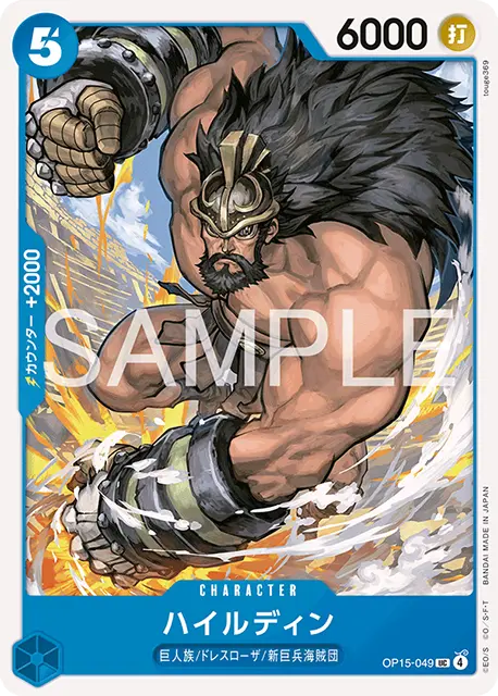 | テキスト ブロッカー 登場時カード2枚を引き、自分の手札1枚を捨てる。その後、自分のリーダーとキャラ1枚にレストのドン‼2枚ずつまでを、付与する。 | |||