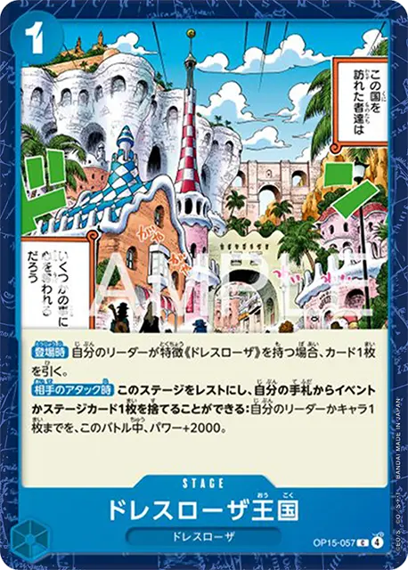 | テキスト このキャラがKOされる場合、代わりに自分の手札からイベント1枚を捨てることができる。 登場時自分の手札から元々のコスト3以下の特徴《ドレスローザ》を持つイベント1枚までを、発動する。 | |||
