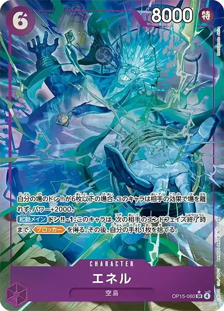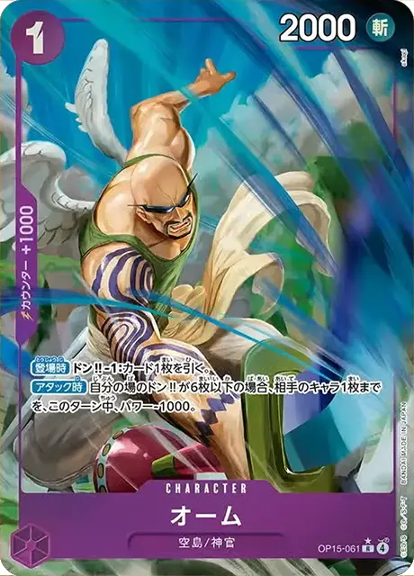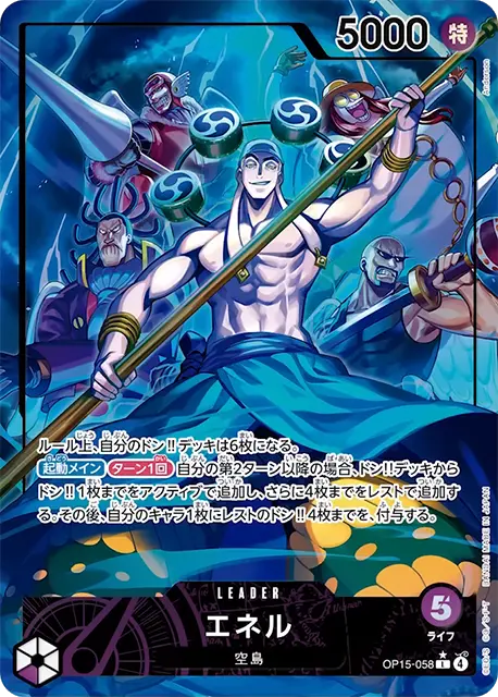 | テキスト 登場時自分のライフの上から1枚を表向きにできる:相手のキャラすべてを、このターン中、パワー-2000。その後、相手のパワー0以下のキャラすべてを、KOする。 起動メインターン1回自分の特徴《空島》を持つ、リーダーかキャラ1枚にレストのドン!!1枚までを、付与する。 | |||