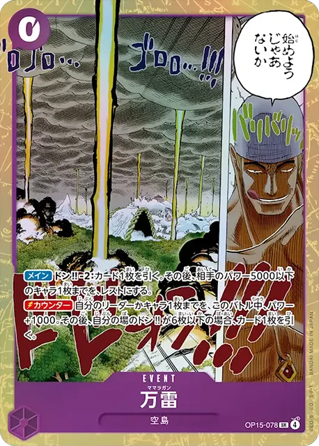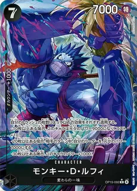 | テキスト 登場時/アタック時ドン‼-2(自分の場のドン‼を指定の数ドン‼デッキに戻すことができる):自分のリーダーが多色で、相手の場のドン‼が5枚以上ある場合、自分の特徴《麦わらの一味》を持つリーダーを、次の相手のエンドフェイズ終了時まで、元々のパワー7000にする。 | |||