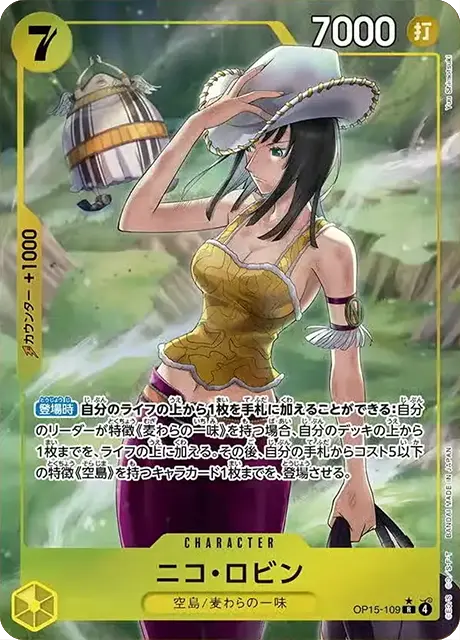 | テキスト 登場時自分のライフの上から1枚を手札に加えることができる:自分のリーダーが特徴《麦わらの一味》を持つ場合、自分のデッキの上から1枚までを、ライフの上に加える。その後、自分の手札からコスト5以下の特徴《空島》を持つキャラカード1枚までを、登場させる。 | |||