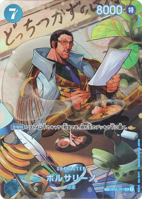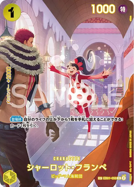 | テキスト 自分のターン中登場時ドン!!-1:自分のリーダーが「サンジ」の場合、自分のトラッシュにあるコスト7以下のイベント1枚までの、メイン効果を発動する。 | |||