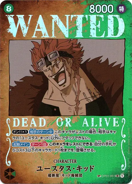 | テキスト 登場時ドン!!デッキからドン!!1枚までを、アクティブで追加する。 起動メインこのキャラをトラッシュに置くことができる:自分の手札からコスト5以下の特徴《キッド海賊団》を持つキャラカード1枚までを、登場させる。 | |||